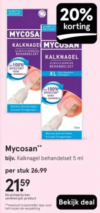 Mycosan Kalknagel Behandelset is een klinisch bewezen behandeling die tot 100% effectief is tegen schimmels. Deze Mycosan precisie kwast bevat 10ml van het effectieve Mycosan serum, samen met 10 nagelvijlen voor een complete behandeling. Geschikt voor diabetici en speciaal ontworpen voor kalknagels. Nu met 20% korting, slechts €26.99 per stuk. Let op: de actieprijs kan variëren per product. Mycosan is een medisch hulpmiddel, dus lees voor het kopen altijd de verpakking. Pak nu je kans en bestel deze effectieve behandeling tegen schimmels. Bekijk de deal en zeg vaarwel tegen kalknagels!
