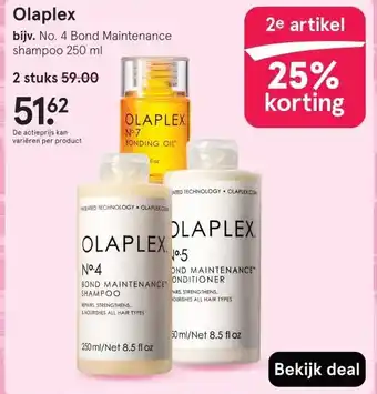De aanbieding is verkrijgbaar in verschillende winkels, bekijk alle producten om de goedkoopste Olaplex te krijgen. Als je graag wilt kijken of het artikel met meer korting te koop is in een andere winkel, bekijk de categorie 'Drogist en Parfumerie'. Wellicht vind je deze aanbiedingen ook interessant: Olaplex, Olaplex - Olaplex Nº 6 Bond Smoother & Olaplex - Olaplex Nº 7 Bonding Oil.
