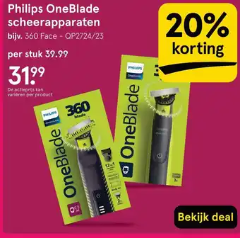 De aanbieding is verkrijgbaar in verschillende winkels, bekijk alle producten om de goedkoopste Philips OneBlade scheerapparaten te krijgen. Als je graag wilt kijken of het artikel met meer korting te koop is in een andere winkel, bekijk de categorie 'Drogist en Parfumerie'. Wellicht vind je deze aanbiedingen ook interessant: Philips OneBlade mesjes en scheerapparaten, Philips navulmesjes OneBlade & Philips OneBlade apparaten.