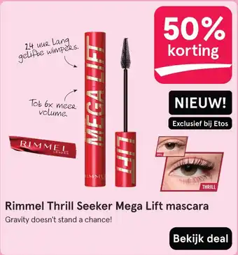 Met de nieuwe Rimmel Thrill Seeker Mega Lift mascara krijg je tot 6x meer volume en 24 uur lang gelift wimpers. Gravity doesn't stand a chance tegen deze exclusieve formule van Rimmel London. Nu verkrijgbaar met 50% korting, alleen bij Etos. Deze mascara tilt je wimpers naar nieuwe hoogten en zorgt voor een dramatische oogopslag. Laat je ogen stralen met deze NIEUWE must-have mascara van Rimmel. Mis deze deal niet en bekijk snel de aanbieding. Voeg wat thrill toe aan je make-up routine met Rimmel Thrill Seeker Mega Lift mascara!