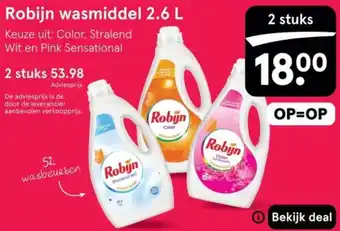 Met Robijn wasmiddel 2.6 L geniet je van 52 wasbeurten vol frisheid en kleurbescherming. Kies uit de varianten Color, Stralend Wit en Pink Sensational. Deze deal bevat 2 stuks voor slechts 53.98, terwijl de adviesprijs 18.00 per stuk is. Wees er snel bij, want OP=OP! Robijn staat bekend om zijn kwaliteit en effectiviteit in het behouden van de kleur en zachtheid van je kleding. Met dit wasmiddel geniet je van langdurige frisheid en stralende kleuren. Bekijk deze deal nu en profiteer van de voordelige prijs voor 2 stuks Robijn wasmiddel. Maak van elke wasbeurt een feestje met Robijn!
