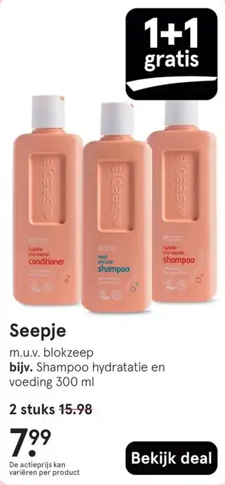 Profiteer nu van de actie waarbij je 2 stuks Seepje Shampoo hydratatie en voeding 300 ml kunt kopen voor slechts 15.98, wat neerkomt op 1+1 gratis. Deze shampoo is speciaal ontwikkeld om je haar te hydrateren en te voeden, met 99.1% hydraterende en voedende ingrediënten. De formule van Seepje is vrij van blokzeep en zorgt voor een optimale verzorging van je haar. Met de actieprijs van 7.99 per stuk kun je nu voordelig genieten van de kwaliteit van Seepje. Bekijk de deal en profiteer van deze aanbieding voor gezond en stralend haar. Let op: de actieprijs kan variëren per product, dus wees er snel bij!
