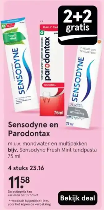 Profiteer nu van de actie waarbij je 2 Sensodyne Fresh Mint tandpasta's en 2 Parodontax Original tandpasta's krijgt voor de prijs van 2. De tandpasta's zijn speciaal ontwikkeld door tandartsen en helpen bij gevoelige tanden en tandvleesproblemen. Sensodyne Fresh Mint zorgt voor een frisse adem en Parodontax Original is een medisch hulpmiddel dat helpt bij het bestrijden van tandvleesproblemen. De tandpasta's zijn 75 ml per stuk en bevatten whitening eigenschappen voor een stralende glimlach. Let op: de actieprijs kan variëren per product, dus wees er snel bij. Lees voor het kopen altijd de verpakking voor de juiste instructies. Bekijk nu deze deal en zorg goed voor je gebit met Sensodyne en Parodontax!