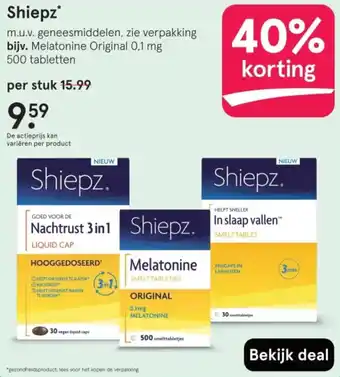 De aanbieding is verkrijgbaar in verschillende winkels, bekijk alle producten om de goedkoopste Shiepz te krijgen. Als je graag wilt kijken of het artikel met meer korting te koop is in een andere winkel, bekijk de categorie 'Drogist en Parfumerie'. Wellicht vind je deze aanbiedingen ook interessant: Shiepz slaapfit tabletten 30tb, Shiepz Nachtrust 3-1 sterk & Shiepz slaapformule tabletten 30tb.