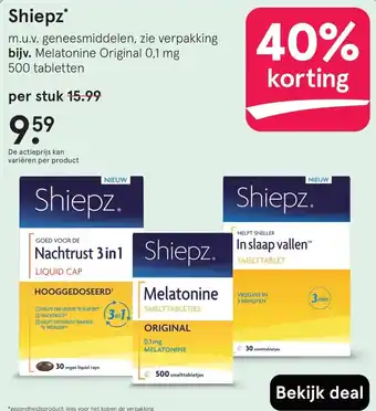 De aanbieding is verkrijgbaar in verschillende winkels, bekijk alle producten om de goedkoopste Shiepz te krijgen. Als je graag wilt kijken of het artikel met meer korting te koop is in een andere winkel, bekijk de categorie 'Drogist en Parfumerie'. Wellicht vind je deze aanbiedingen ook interessant: Shiepz, Shiepz Nachtrust 3-1 sterk & Shiepz slaapfit tabletten 30tb.