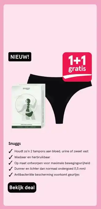 De aanbieding is verkrijgbaar in verschillende winkels, bekijk alle producten om de goedkoopste Snuggs te krijgen. Als je graag wilt kijken of het artikel met meer korting te koop is in een andere winkel, bekijk de categorie 'Drogist en Parfumerie'. Wellicht vind je deze aanbiedingen ook interessant: Snuggs menstruatie- ondergoed, aanbieding 2 & aanbieding 3.