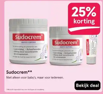 De aanbieding is verkrijgbaar in verschillende winkels, bekijk alle producten om de goedkoopste Sudocrem te krijgen. Als je graag wilt kijken of het artikel met meer korting te koop is in een andere winkel, bekijk de categorie 'Drogist en Parfumerie'. Wellicht vind je deze aanbiedingen ook interessant: Sudocrem 125gr, Sudocrem & Sudocrem Pot.