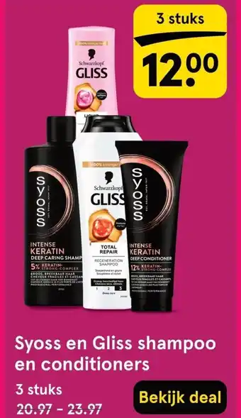 Deze Syoss en Gliss shampoo en conditioners is nu in de aanbieding bij Etos. Bekijk ook andere lopende acties en bespaar met scherpe prijzen of online deals. Bestel Syoss en Gliss shampoo en conditioners via Etos website of koop het product met korting in een winkel bij jou in de buurt. Op Folderz.nl verzamelen we dagelijks de beste Syoss en Gliss shampoo en conditioners aanbiedingen. Klik op het belletje om een gratis melding te ontvangen zodra er weer een nieuwe actie of prijsverlaging voor Syoss en Gliss shampoo en conditioners beschikbaar is.Veelgestelde vragen over Syoss en Gliss shampoo en conditioners