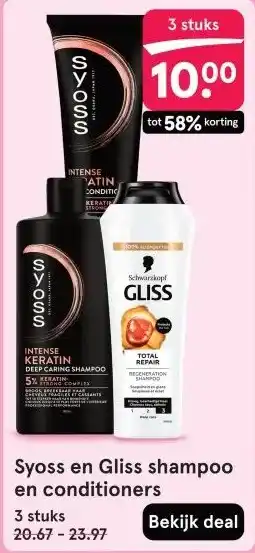 De aanbieding is verkrijgbaar in verschillende winkels, bekijk alle producten om de goedkoopste Syoss en Gliss shampoo en conditioners te krijgen. Als je graag wilt kijken of het artikel met meer korting te koop is in een andere winkel, bekijk de categorie 'Drogist en Parfumerie'. Wellicht vind je deze aanbiedingen ook interessant: Syoss, Taft, Got2b en Gliss, Gliss, Schwarzkopf en Syoss Haarverzorging & Alle Andrélon, Syoss en Gliss.