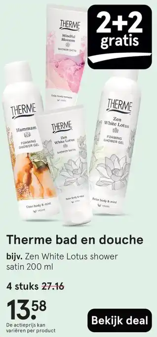 De aanbieding is verkrijgbaar in verschillende winkels, bekijk alle producten om de goedkoopste Therme bad en douche te krijgen. Als je graag wilt kijken of het artikel met meer korting te koop is in een andere winkel, bekijk de categorie 'Drogist en Parfumerie'. Wellicht vind je deze aanbiedingen ook interessant: Therme bad en douche, Therme Bad en Douche & Kruidvat 2-In-1 Bad & Douche.
