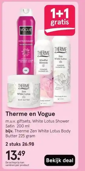 De aanbieding is verkrijgbaar in verschillende winkels, bekijk alle producten om de goedkoopste Therme en Vogue te krijgen. Als je graag wilt kijken of het artikel met meer korting te koop is in een andere winkel, bekijk de categorie 'Drogist en Parfumerie'. Wellicht vind je deze aanbiedingen ook interessant: Vogue douche en Vogue Men deodorant, Vogue deodorant & Vogue deodorant.