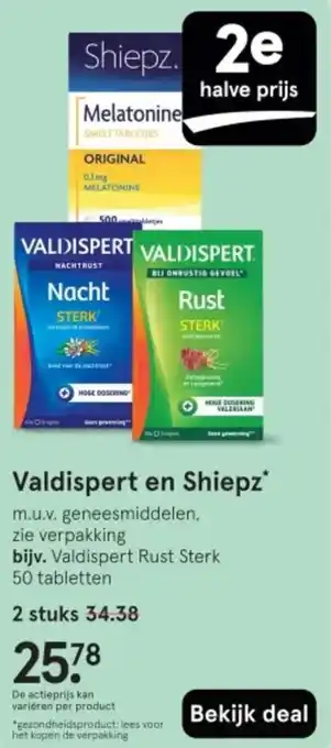Profiteer nu van de actie waarbij je bij aankoop van 2 stuks Valdispert en Shiepz producten de 2e voor de helft van de prijs krijgt. Deze gezondheidsproducten bevatten een hoge dosering valeriaan en melatonine, wat zorgt voor een goede nachtrust en rust bij een onrustig gevoel. De Original Valdispert Rust Sterk tabletten zijn speciaal ontwikkeld om je te helpen ontspannen en beter te slapen. Let op: de actieprijs kan variëren per product, dus bekijk de deal en lees voor het kopen de verpakking voor meer informatie. Valdispert en Shiepz zijn niet-geneesmiddelen en zijn geschikt voor mensen die op zoek zijn naar natuurlijke oplossingen voor slaapproblemen en stress.