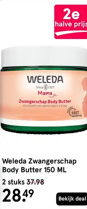 Verwen jezelf tijdens je zwangerschap met de Weleda Zwangerschap Body Butter. Deze rijke boter is speciaal ontwikkeld om striae te voorkomen en te verminderen. Dankzij de snelle absorptie en massage wordt je huid optimaal verzorgd en gehydrateerd. Met de actie 2 stuks voor slechts 37.98 euro in plaats van 28.49 euro per stuk, is het nu extra voordelig om deze heerlijke body butter in huis te halen. Weleda, al sinds 1921 mama's favoriet als het gaat om natuurlijke verzorgingsproducten. Bekijk snel de deal en geniet van een stralende huid tijdens en na je zwangerschap!