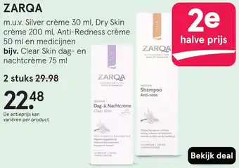 Ontdek de effectieve producten van ZARQA, zoals de Anti-Redness crème en Clear Skin dag- en nachtcrème. Speciaal ontwikkeld voor de gevoelige huid, reguleren ze de talgproductie, voorkomen puistjes en kalmeren de huid. Ook biedt ZARQA een Anti-roos shampoo die roos en schilfers effectief bestrijdt en de hoofdhuid herstelt. Alle producten zijn 0% parfum, vegan en hypoallergeen. Profiteer nu van de actieprijs: 2 stuks Clear Skin dag- en nachtcrème voor slechts 29.98. Bekijk de deal en ontvang de tweede voor de halve prijs. Laat ZARQA jouw huid en haar verzorgen met de kracht van de Dode Zee mineralen.