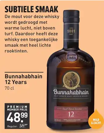 De mout voor deze whisky wordt gedroogd met warme lucht, niet boven turf. Daardoor heeft deze whisky een toegankelijke smaak met heel lichte rooktinten. Bunnahabhain 12 Years is een premium Islay single malt Scotch whisky, gedistilleerd in small batches sinds 1881. Deze milde en zachte whisky heeft subtiele smaaktonen en is perfect voor liefhebbers van een verfijnde whiskyervaring. Met een inhoud van 70 cl en een prijs van slechts €48.99 voor premium leden, is deze whisky een uitstekende keuze voor kenners en beginners. Proef de rijke geschiedenis van Bunnahabhain in elke slok van deze 12 jaar oude whisky.