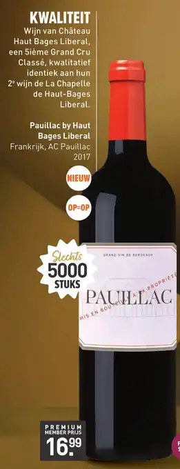 Geniet van de kwaliteit van de Château Haut Bages Liberal wijn uit Pauillac, Frankrijk. Deze 5ième Grand Cru Classé is van premium kwaliteit en identiek aan hun La Chapelle de Haut-Bages Liberal. Met slechts 5000 flessen beschikbaar, is dit een unieke kans om deze Grand Vin de Bordeaux te proeven. Mis deze kans niet, want OP=OP! Deze nieuwe wijn uit 2017 is ferm en stevig van smaak, perfect voor de echte wijnliefhebber. Als premium member profiteer je van een speciale prijs van slechts 16.99. Mis en bouteille à la propriété, deze wijn is een absolute aanrader voor liefhebbers van kwaliteitswijnen.