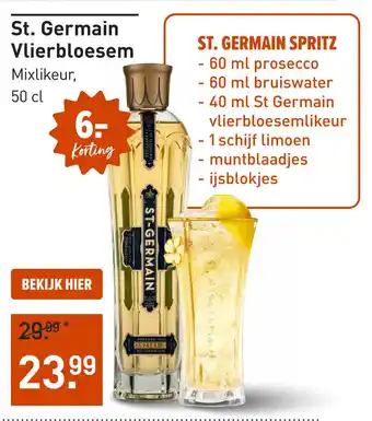 Geniet van de heerlijke St. Germain Vlierbloesem Mixlikeur in een verfrissende ST. GERMAIN SPRITZ cocktail. Mix 60 ml prosecco, 60 ml bruiswater en 40 ml St Germain vlierbloesemlikeur met een schijf limoen, muntblaadjes en ijsblokjes. Deze mixlikeur van St. Germain is perfect voor het maken van verfrissende cocktails en is nu verkrijgbaar met een korting van 6%. Bekijk hier de aanbieding voor slechts €23.99 in plaats van €29.99*. Haal de zomer in huis met de St. Germain Vlierbloesem Mixlikeur en geniet van de unieke smaak van vlierbloesem in je favoriete drankjes. ATELIER No. D 52141-20 ST-GERMAIN.
