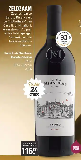 Deze zeer schaarse Barolo Riserva uit de 'bibliotheek' van Casa E. di Mirafiori is een ware parel. Gemaakt van de beste nebbiolo-druiven en met 10 jaar extra rijping, is deze wijn een echte traktatie voor de liefhebbers. De Barolo riserva uit 2005 heeft maar liefst 93 punten gekregen van Falstaff en is een absolute aanrader voor de kenners. Slechts 24 stuks beschikbaar voor een premium member prijs van 116.00. Casa E. di Mirafiore, opgericht in 1858, staat bekend om zijn kwaliteitswijnen en deze Barolo is daar geen uitzondering op. Een FERM & STEVIG glas wijn uit Italië, DOCG Barolo, dat niet mag ontbreken in de collectie van de echte wijnliefhebber.