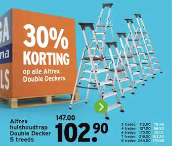 De prijs van de Altrex huishoudtrap Double Decker kan ook teruggevonden worden hierboven op de pagina, samen met de datum van wanneer de aanbieding beschikbaar is. Ook kun je de prijzen in de huidige GAMMA folder of op de GAMMA website controleren. De aanbiedingen verzekeren je van het kopen van de GAMMA producten voor de laagste prijs.