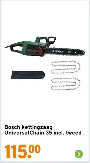 De prijs van de Bosch kettingzaag UniversalChain 35 incl. tweede ketting kan ook teruggevonden worden hierboven op de pagina, samen met de datum van wanneer de aanbieding beschikbaar is. Ook kun je de prijzen in de huidige GAMMA folder of op de GAMMA website controleren. De aanbiedingen verzekeren je van het kopen van de GAMMA producten voor de laagste prijs.