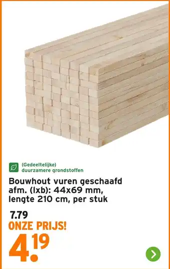 Bouwhout vuren geschaafd 44x69 mm, lengte 210 cm, duurzamere grondstoffen, ONZE PRIJS!