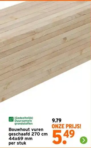 De Bouwhout vuren geschaafd is momenteel met korting verkrijgbaar bij GAMMA. Hier vind je alle details over prijs, geldigheidsduur en actievoorwaarden. Vergeet niet om ook andere aanbiedingen en deals voor Bouwhout vuren geschaafd te bekijken zodat je zeker weet dat je de beste prijs betaalt. De kortingsactie loopt van 28-04-2026 tot 03-05-2026. Is de actie inmiddels verlopen? Geen zorgen, vergelijk dan soortgelijke aanbiedingen of volg de productcategorie voor toekomstige prijsverlagingen. Zo koop je altijd met voordeel.Veelgestelde vragen over Bouwhout vuren geschaafd