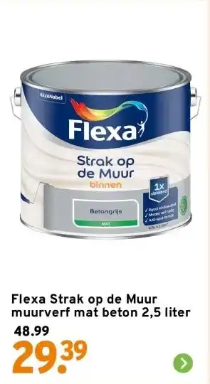 De prijs van de Flexa Strak op de Muur muurverf mat beton 2,5 liter kan ook teruggevonden worden hierboven op de pagina, samen met de datum van wanneer de aanbieding beschikbaar is. Ook kun je de prijzen in de huidige GAMMA folder of op de GAMMA website controleren. De aanbiedingen verzekeren je van het kopen van de GAMMA producten voor de laagste prijs.