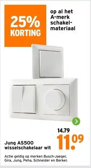 De prijs van de Jung AS500 wisselschakelaar wit kan ook teruggevonden worden hierboven op de pagina, samen met de datum van wanneer de aanbieding beschikbaar is. Ook kun je de prijzen in de huidige GAMMA folder of op de GAMMA website controleren. De aanbiedingen verzekeren je van het kopen van de GAMMA producten voor de laagste prijs.