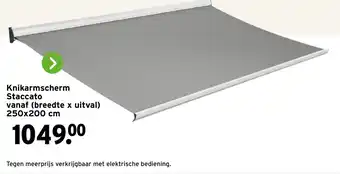 GAMMA biedt naast de Knikarmscherm Staccato een ruime collectie producten aan. Houd de wekelijkse GAMMA folder in de gaten om de beste aanbiedingen en acties te vinden. Naast Knikarmscherm Staccato, kunt u ook de volgende aanbiedingen vinden: Knikarmscherm Staccato op maat vanaf, Knikarmscherm Staccato (breedte x uitval) 500 cm x 300 cm bedieningszijde links doekkleur grijs & Knikarmscherm Calando op maat.