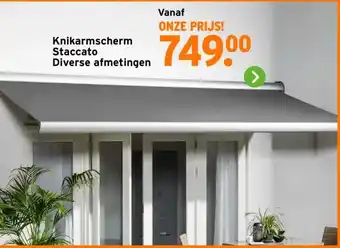 De prijs van de Knikarmscherm Staccato Diverse afmetingen kan ook teruggevonden worden hierboven op de pagina, samen met de datum van wanneer de aanbieding beschikbaar is. Ook kun je de prijzen in de huidige GAMMA folder of op de GAMMA website controleren. De aanbiedingen verzekeren je van het kopen van de GAMMA producten voor de laagste prijs.