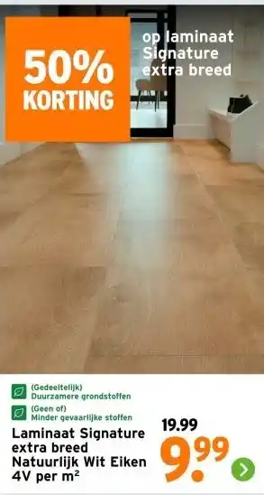 Deze Laminaat Signature extra breed Natuurlijk Wit Eiken 4V per m² is nu in de aanbieding bij GAMMA. Bekijk ook andere lopende acties en bespaar met scherpe prijzen of online deals. Bestel Laminaat Signature extra breed Natuurlijk Wit Eiken 4V per m² via GAMMA website of koop het product met korting in een winkel bij jou in de buurt. Op Folderz.nl verzamelen we dagelijks de beste Laminaat Signature extra breed Natuurlijk Wit Eiken 4V per m² aanbiedingen. Klik op het belletje om een gratis melding te ontvangen zodra er weer een nieuwe actie of prijsverlaging voor Laminaat Signature extra breed Natuurlijk Wit Eiken 4V per m² beschikbaar is.Veelgestelde vragen over Laminaat Signature extra breed Natuurlijk Wit Eiken 4V per m²