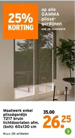 De prijs van de Maatwerk enkel plisségordijn 7217 bruin lichtdoorlaten kan ook teruggevonden worden hierboven op de pagina, samen met de datum van wanneer de aanbieding beschikbaar is. Ook kun je de prijzen in de huidige GAMMA folder of op de GAMMA website controleren. De aanbiedingen verzekeren je van het kopen van de GAMMA producten voor de laagste prijs.