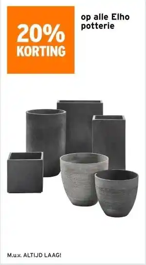 De prijs van de op alle Elho potterie kan ook teruggevonden worden hierboven op de pagina, samen met de datum van wanneer de aanbieding beschikbaar is. Ook kun je de prijzen in de huidige GAMMA folder of op de GAMMA website controleren. De aanbiedingen verzekeren je van het kopen van de GAMMA producten voor de laagste prijs.