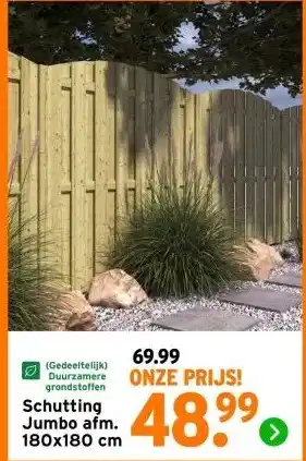 De Schutting Jumbo afm. 180x180 cm is momenteel met korting verkrijgbaar bij GAMMA. Hier vind je alle details over prijs, geldigheidsduur en actievoorwaarden. Vergeet niet om ook andere aanbiedingen en deals voor Schutting Jumbo afm. 180x180 cm te bekijken zodat je zeker weet dat je de beste prijs betaalt. De kortingsactie loopt van 23-02-2026 tot 01-03-2026. Is de actie inmiddels verlopen? Geen zorgen, vergelijk dan soortgelijke aanbiedingen of volg de productcategorie voor toekomstige prijsverlagingen. Zo koop je altijd met voordeel.Veelgestelde vragen over Schutting Jumbo afm. 180x180 cm