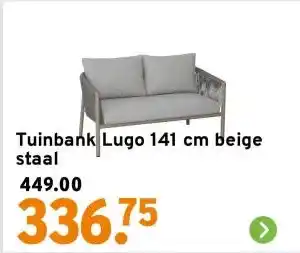 GAMMA biedt naast de Tuinbank Lugo 141 cm beige staal een ruime collectie producten aan. Houd de wekelijkse GAMMA folder in de gaten om de beste aanbiedingen en acties te vinden. Naast Tuinbank Lugo 141 cm beige staal, kunt u ook de volgende aanbiedingen vinden: Tuinbank Lugo 141 cm beige staal, Tuinstoel Lugo beige staal & Tuinstoel Lugo beige staal.