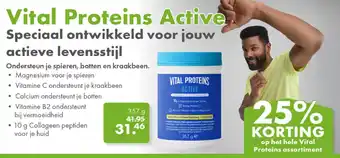 Vital Proteins Active is speciaal ontwikkeld voor jouw actieve levensstijl. Het bevat magnesium om je spieren te ondersteunen, vitamine C voor je kraakbeen, calcium voor je botten en vitamine B2 tegen vermoeidheid. Daarnaast bevat het 10 g collageen peptiden die goed zijn voor je huid. Met 10 collageen peptiden per portie helpt dit supplement je om je spieren, botten en kraakbeen gezond te houden. Profiteer nu van 25% korting op het hele Vital Proteins assortiment en geef je lichaam de ondersteuning die het verdient. Voel je energiek en sterk met Vital Proteins Active!