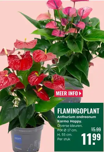 GroenRijk biedt naast de Flamingoplant een ruime collectie producten aan. Houd de wekelijkse GroenRijk folder in de gaten om de beste aanbiedingen en acties te vinden. Naast Flamingoplant, kunt u ook de volgende aanbiedingen vinden: FLORASELF Flamingoplant Anthurium andreanum H 35-40 cm Ø 12 cm pot, aanbieding 2 & aanbieding 3.