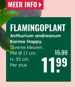 GroenRijk biedt naast de Flamingoplant een ruime collectie producten aan. Houd de wekelijkse GroenRijk folder in de gaten om de beste aanbiedingen en acties te vinden. Naast Flamingoplant, kunt u ook de volgende aanbiedingen vinden: FLORASELF Flamingoplant Anthurium andreanum H 35-40 cm Ø 12 cm pot, aanbieding 2 & aanbieding 3.
