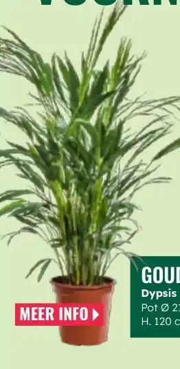 GroenRijk biedt naast de Goudpalm een ruime collectie producten aan. Houd de wekelijkse GroenRijk folder in de gaten om de beste aanbiedingen en acties te vinden. Naast Goudpalm, kunt u ook de volgende aanbiedingen vinden: Goudpalm, Dypsis lutescens potplant, goudpalm, 24 cm & aanbieding 3.