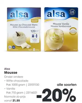Geniet van de heerlijke Alsa Mousse in de smaken Witte Chocolade en Vanille. Deze professionele mousse mix is gemaakt volgens een nieuwe receptuur voor een nog betere smaakervaring. Kies uit een pak van 710 gram met 2x500g porties, genoeg voor 120-125 porties. De mousse is eenvoudig te bereiden en perfect voor feestjes, speciale gelegenheden of gewoon als verwennerij. De witte chocolademousse heeft een romige textuur en rijke smaak, terwijl de vanillemousse een heerlijke vanillesmaak heeft. Profiteer nu van 20% korting op alle soorten Alsa Mousse, met een normale prijs vanaf 21,55. Trakteer jezelf en je gasten op deze heerlijke en professionele mousse van Alsa!