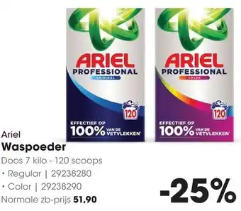 Met Ariel Waspoeder Original ben je verzekerd van een effectieve reiniging van al je kleding. Deze doos van 7 kilo bevat 120 scoops waspoeder, waarmee je tot wel 100% vetvlekken en kleurvlekken kunt verwijderen. De formule is speciaal ontwikkeld om zelfs de meest hardnekkige vlekken aan te pakken. Dankzij de Color variant blijven je gekleurde kledingstukken langer mooi en stralend. Normaal kost deze doos 51,90, maar nu profiteer je van 25% korting. Met Ariel Waspoeder Original haal je dus niet alleen een professioneel en effectief wasmiddel in huis, maar bespaar je ook nog eens op je uitgaven voor de was.
