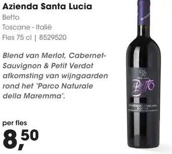 Geniet van de heerlijke Azienda Santa Lucia wijn, een blend van Merlot, Cabernet Sauvignon en Petit Verdot afkomstig van wijngaarden rond het 'Parco Naturale della Maremma' in Toscane, Italië. Deze prachtige rode wijn uit de Maremma Toscana regio is verkrijgbaar voor slechts 8,50 per fles. Laat je verrassen door de rijke smaken en aroma's van deze bijzondere blend, die perfect tot zijn recht komt bij diverse gerechten of gewoon om van te genieten tijdens een gezellige avond. Bestel nu jouw fles Azienda Santa Lucia en proef de pure smaak van Toscane!