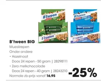 De aanbieding is verkrijgbaar in verschillende winkels, bekijk alle producten om de goedkoopste B'tween BIG te krijgen. Als je graag wilt kijken of het artikel met meer korting te koop is in een andere winkel, bekijk de categorie 'Groothandel'. Wellicht vind je deze aanbiedingen ook interessant: 2e halve prijs: Hero B'tween Mueslireep, Big Jeffbarbecuerooster & 2e halve prijs: 10x Hero B'tween Mueslireep Zero.