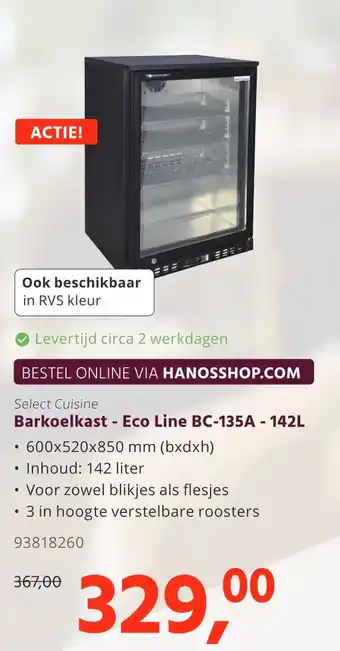 De Barkoelkast - Eco Line BC-135A is een ideale koelkast voor het koelen van dranken in horecagelegenheden. Met een inhoud van 142 liter en 3 in hoogte verstelbare roosters biedt deze koelkast voldoende ruimte voor zowel blikjes als flesjes. De afmetingen van 600x520x850 mm (bxdxh) maken het een compacte en praktische oplossing voor elke bar. De Barkoelkast is ook beschikbaar in RVS kleur en wordt geleverd met een levertijd van circa 2 werkdagen. Bestel deze koelkast nu online via Hanosshop.com en profiteer van de scherpe prijs van 329,00 euro in plaats van 367,00 euro. Select Cuisine staat garant voor kwaliteit en duurzaamheid, dus mis deze actie niet!