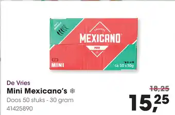 Geniet van de heerlijke De Vries Mini Mexicano's in een handige doos van 50 stuks. Elke Mini Mexicano weegt 30 gram en is perfect als snack of bijgerecht. De Original Mini Mexicano's zijn ca. 50 x 30g en hebben een pittige Mexicaanse smaak die je zal verrassen. De Mini Mexicano's zijn eenvoudig te bereiden in de oven, airfryer of frituurpan en zijn ideaal voor feestjes, borrels of gewoon als lekkere snack. Bestel nu de De Vries Mini Mexicano's en geniet van de authentieke smaak van Mexico in mini formaat. Met deze doos van 50 stuks heb je altijd genoeg Mini Mexicano's in huis voor elke gelegenheid.