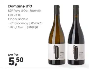 Domaine d'O, IGP Pays d'Oc - Frankrijk. Ontdek de heerlijke smaken van Chardonnay en Pinot Noir van Domaine d'O. Deze kwaliteitswijnen zijn verkrijgbaar per fles van 75 cl voor slechts 5,50. Onder andere de Chardonnay met code 8510970 en de Pinot Noir met code 8510980 zijn absolute aanraders. Geniet van de rijke aroma's en de verfijnde smaken van deze Franse wijnen. Perfect voor bij een gezellig diner of gewoon om van te genieten op elk moment. Bestel nu jouw fles Domaine d'O Chardonnay of Pinot Noir en laat je verrassen door de uitstekende kwaliteit en de betaalbare prijs. Proost op het goede leven met Domaine d'O!