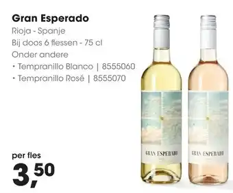 Geniet van de heerlijke smaken van Gran Esperado uit Rioja, Spanje. Deze wijn is verkrijgbaar per fles voor slechts 3,50. Bij aankoop van een doos met 6 flessen van 75 cl kun je onder andere kiezen uit Tempranillo Blanco (8555060) en Tempranillo Rosé (8555070). De Gran Esperado wijn staat bekend om zijn kwaliteit en rijke smaak. Of je nu een liefhebber bent van witte, rosé of rode wijn, er is voor ieder wat wils. Laat je verrassen door de unieke aroma's en proef de Spaanse passie in elke slok. Bestel nu jouw favoriete Gran Esperado wijn en geniet van een heerlijk glas bij elke gelegenheid.