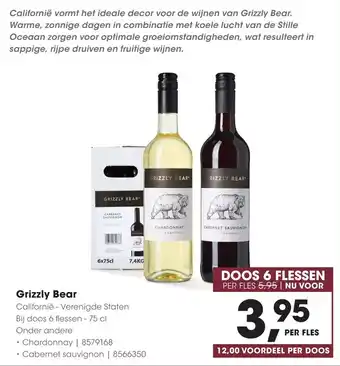 Californië vormt het ideale decor voor de wijnen van Grizzly Bear. Warme, zonnige dagen in combinatie met koele lucht van de Stille Oceaan zorgen voor optimale groeiomstandigheden, wat resulteert in sappige, rijpe druiven en fruitige wijnen. Deze doos bevat 6 flessen van 75 cl, waaronder Chardonnay en Cabernet Sauvignon. Geniet van de heerlijke smaken van Californië met Grizzly Bear wijnen. Normaal kost een fles 5,95, maar nu slechts 3,95 per fles. Profiteer van 12,00 voordeel per doos van 6 flessen. Ontdek de smaak van Californië met Grizzly Bear!