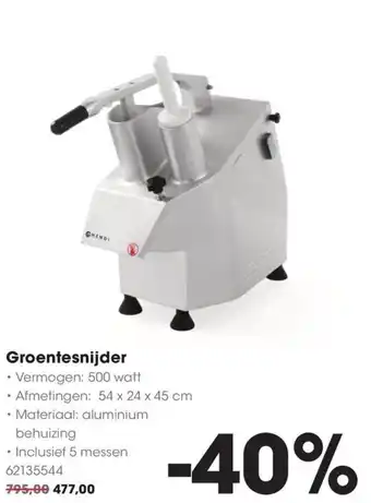 Deze groentesnijder heeft een vermogen van 500 watt en is gemaakt van hoogwaardig aluminium. Met afmetingen van 54 x 24 x 45 cm is het een compact en handig apparaat voor in de keuken. De groentesnijder wordt geleverd met 5 verschillende messen, zodat je diverse snijtechnieken kunt toepassen. Of je nu groenten wilt snijden voor een salade, soep of roerbakgerecht, met deze groentesnijder gaat het snel en eenvoudig. Normaal gesproken kost deze groentesnijder 795,00, maar nu is hij afgeprijsd naar 477,00, wat neerkomt op een korting van 40%. Profiteer nu van deze aanbieding en maak het bereiden van groentegerechten een stuk makkelijker en leuker!