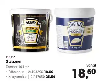 Ontdek de heerlijke sauzen van Heinz, al sinds 1869 een begrip. Kies voor onze fritessaus met 25% olie of onze professionele mayonaise, beide verkrijgbaar in een handige emmer van 10 liter. De fritessaus is te bestellen vanaf €18,50 en de mayonaise vanaf €25,50. Perfect voor gebruik in de horeca of andere professionele keukens. Met de kwaliteit die je van Heinz gewend bent, zullen jouw gerechten nog lekkerder smaken. Bestel nu en geniet van de heerlijke smaak van onze sauzen in al jouw gerechten. Heinz sauzen: ONZE HEERLIJKE SAUS voor de echte fijnproevers!